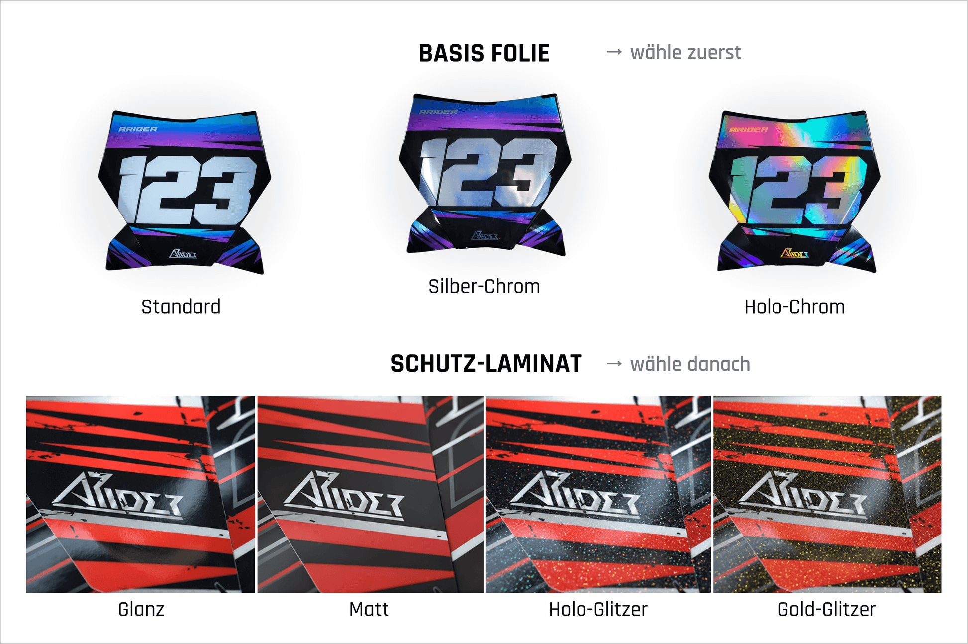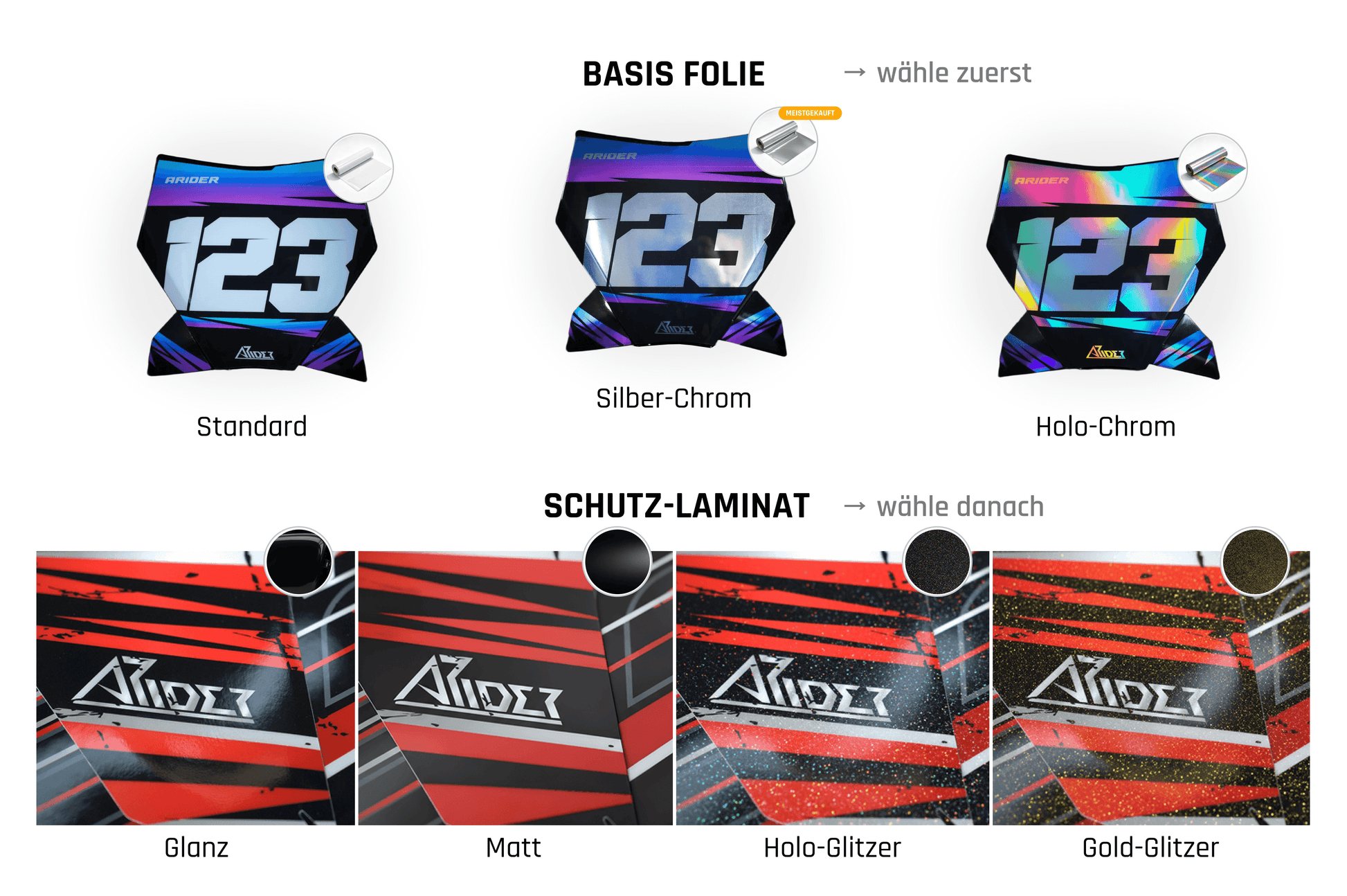 Our high-quality 0.1 mm (100 µ) vinyl film provides the perfect base for an intense, radiant print. The 300 µ laminate gives your graphics and fairings optimal protection from scratches, weather and daily wear. And thanks to our high-tack adhesive with fine air-release channels, application is a breeze—bubble-free and built for maximum durability.